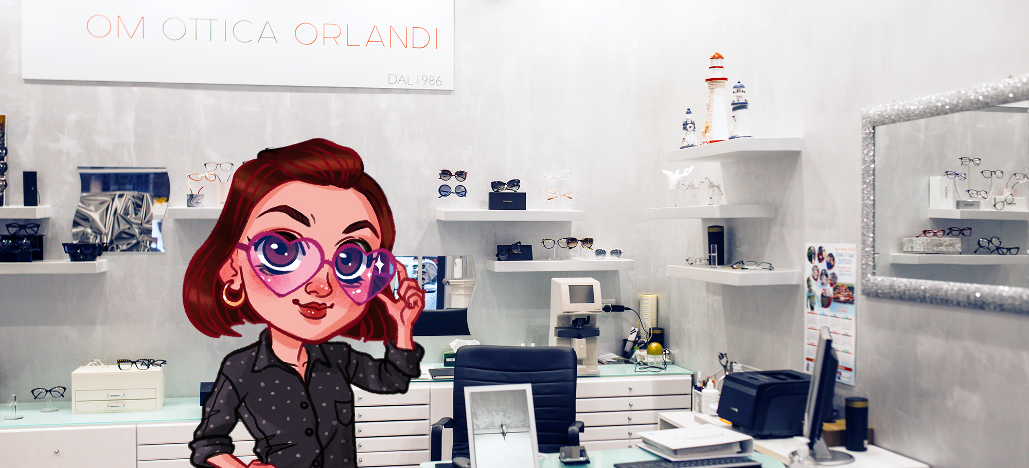 Ecco un esempio di mascotte realizzata per il racconto on e offline di Ottica Orlandi. Il personaggio illustrato è una riproduzione in chiave cartoon della titolare, Francesca, che ha scelto di utilizzare la mascotte per accompagnare il racconto delle novità sui propri canali social.